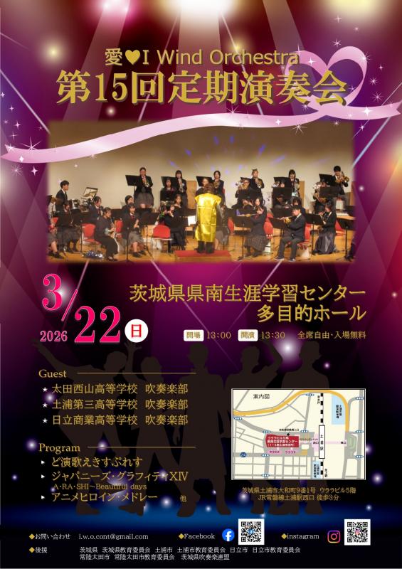 3/22(日)13:30より、茨城県県南生涯学習センター多目的ホールにて行われる、愛♡I Wind Orchestra定期演奏会に本校吹奏楽部がゲスト出演させていただくことになりました。当日は太田西山高校と日立商業高校の吹奏楽部も皆さんも参加します。全席自由・入場無料となっておりますので、お時間がある方はぜひご来場ください。